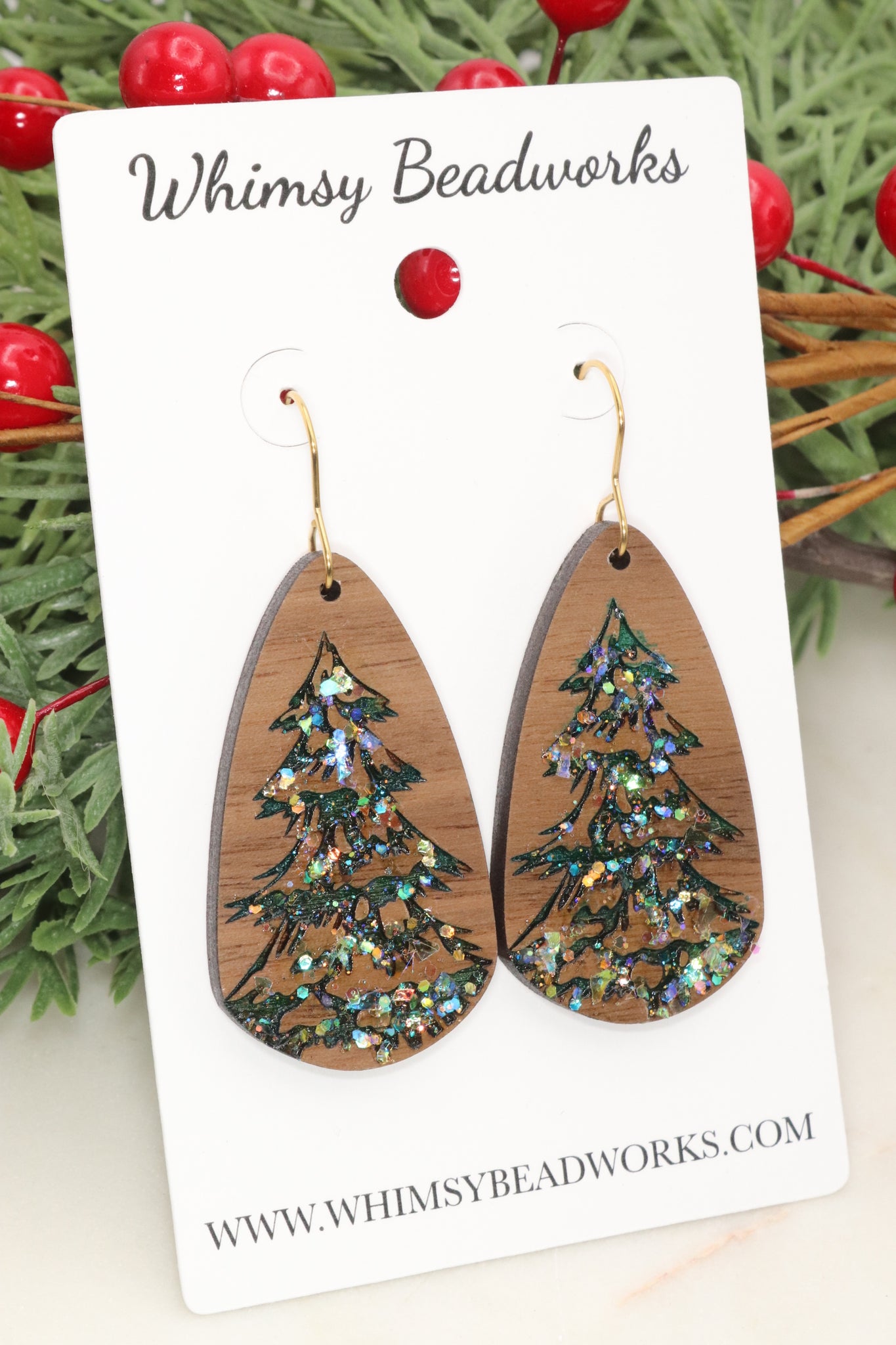 These hand painted walnut wood Christmas Tree Earrings are a festive, lightweight, and eye-catching accessory for the holiday season. Each pair is laser-cut from real walnut wood and hand painted with holiday sparkle in your choice of Clear or Green. Perfect for anyone who loves unique handmade holiday jewelry, Christmas earrings, and wood statement earrings.