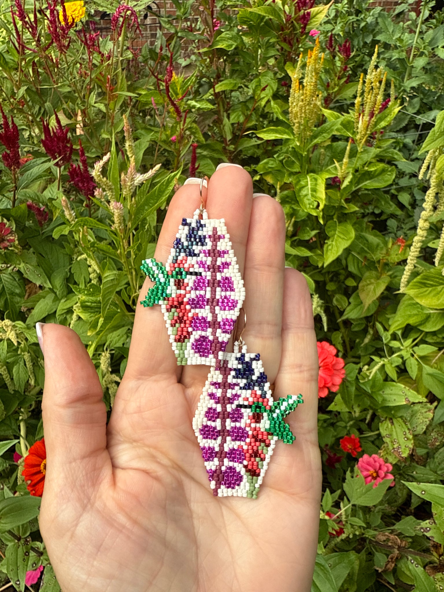 Bring the beauty of the garden to your jewelry collection with these handmade hummingbird wildflower beaded earrings. Each earring is meticulously hand woven with colorfulĀ seed beads, featuring a radiant ruby-throated hummingbird hovering among fireweed, Indian paintbrush, and lupine flowers.
